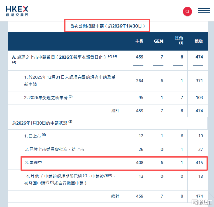 据港交所数据,截至2026年1月30日,正在处理中的IPO公司有415家,其中2026年受理的新申请有103家。