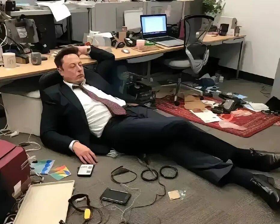 而在工厂角落的临时办公区,马斯克瘫倒在脏兮兮的地毯上,枕着安全帽着了——这是他连续第三晚睡在工厂。